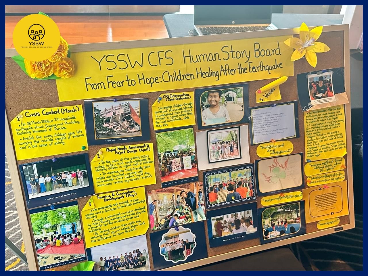 YSSW အနေနဲ့ မတ်လ ၂၆ ရက်နေ့က ကျင်းပခဲ့တဲ့ “From Tragedy to Preparedness, Building a Culture of Earthquake Resilience in Myanmar” အခမ်းအနားကို ပါဝင်တက်ရောက်ခဲ့ပြီး၊ ငလျင်ဘေးဒဏ်ခံခဲ့ရတဲ့ ကလေးများအတွက် ဆောင်ရွက်ခဲ့တဲ့ Child-Friendly Space (CFS) Project အကြောင်းကို Exhibition Booth အဖြစ် မျှဝေတင်ပြခဲ့ပါတယ်။