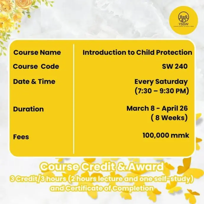 Yangon School of Social Work မှ ဖွင့်လှစ်မည့် Introduction to Child Protection (SW 204) သင်တန်းကို တက်ရောက်ပြီး မြန်မာနိုင်ငံရဲ့ ကလေးငယ်များအတွက် ပိုမိုဘေးကင်းလုံခြုံပြီး အနာဂတ်တောက်ပစေမယ့် ပထမဆုံးခြေလှမ်းကို စတင်လိုက်ပါ။