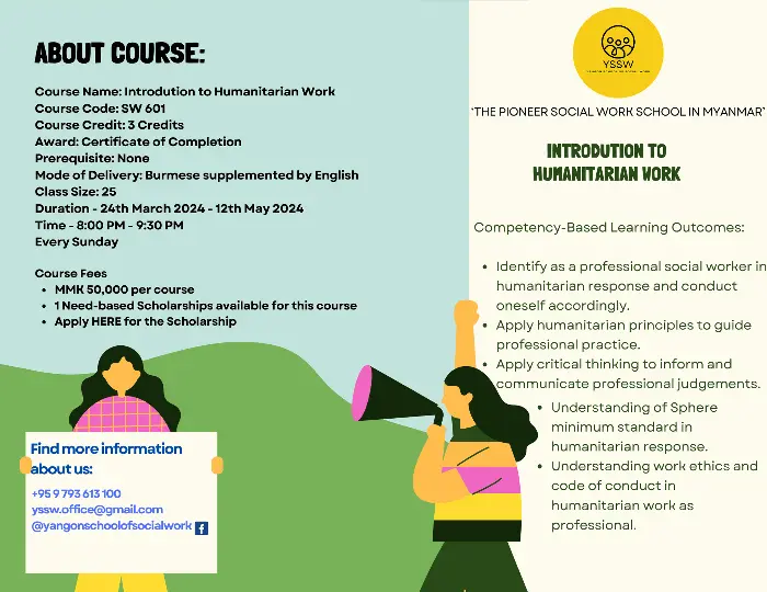YSSW Wave 6 မှာဖွင့်လှစ်တော့မယ် သင်တန်းအသစ်တစ်ခုကတော့ Introduction to Humanitarian Work ဆိုတဲ့ အတန်းလေးပဲဖြစ်ပါတယ်။