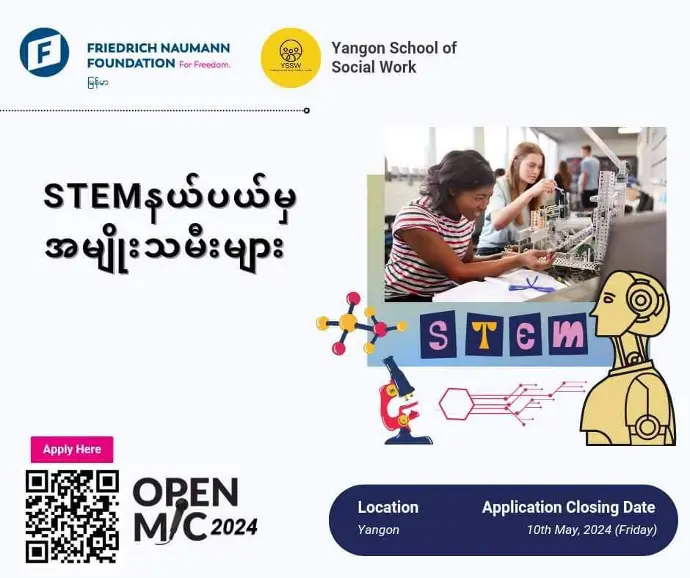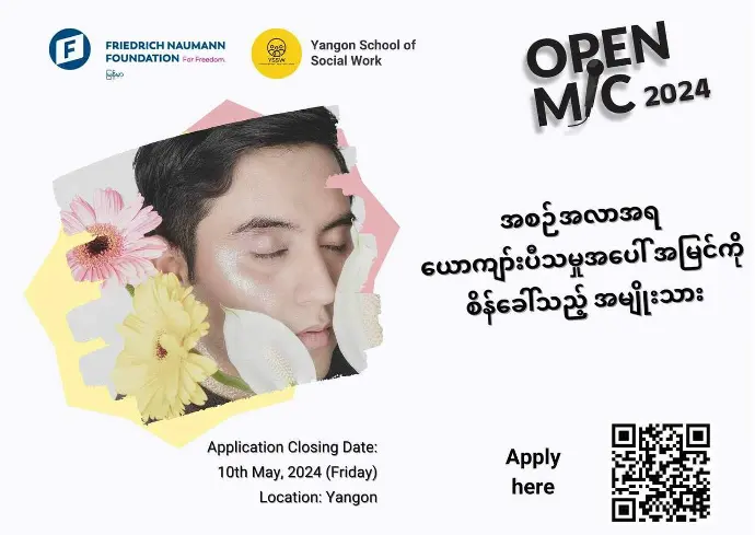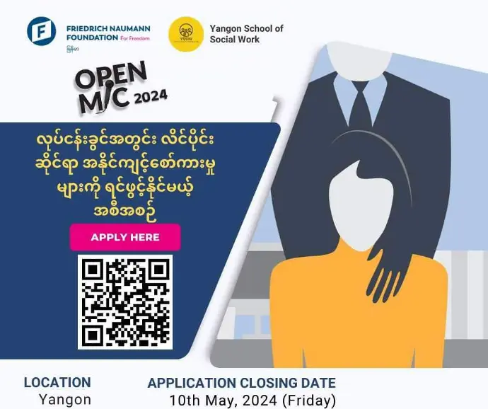 Open Mic နဲ့ ပတ်သတ်ပြီး သိလိုတဲ့မေးခွန်းတွေရှိရင်လည်း Yangon School of Social Work Facebook Page Messenger တိုက်ရိုက်ဆက်သွယ်မေးမြန်းနိုင်ပါတယ်။