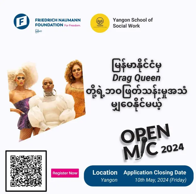 ဒီလိုမျိုး Drag Queen တွေဟာ မြန်မာ့လူ့အသိုင်းအဝိုင်းမှာ လူသိနည်းကြပြီး ခွဲခြားဆက်ဆံမှုတွေကိုလည်း ကြုံတွေ့ခဲ့ရ၊ ယခုလည်း ကြုံတွေ့နေရဆဲဖြစ်ပါတယ်။ Drag Queen ဆိုတာဟာ လူအများကို Drag Queen အနုပညာ နဲ့ ဖျော်ဖြေနေတဲ့ အသက်မွေးဝမ်းကြောင်းပညာရပ်တစ်ခုသာဖြစ်ပါတယ်။ သင်ကိုယ်တိုင်လည်း Drag Queen တစ်ယောက်ဖြစ်ပြီး မြန်မာနိုင်ငံမှာရှိတဲ့ Drag Queen တို့ရဲ့ ဘဝဖြတ်သန်းမှုအသံတွေကို ဖွင့်ဟချင်တယ်ဆိုရင်တော့ OpenMic 2024 ရဲ့ Speaker တစ်ယောက်အဖြစ် အခုပဲပါဝင်လိုက်ပါ။