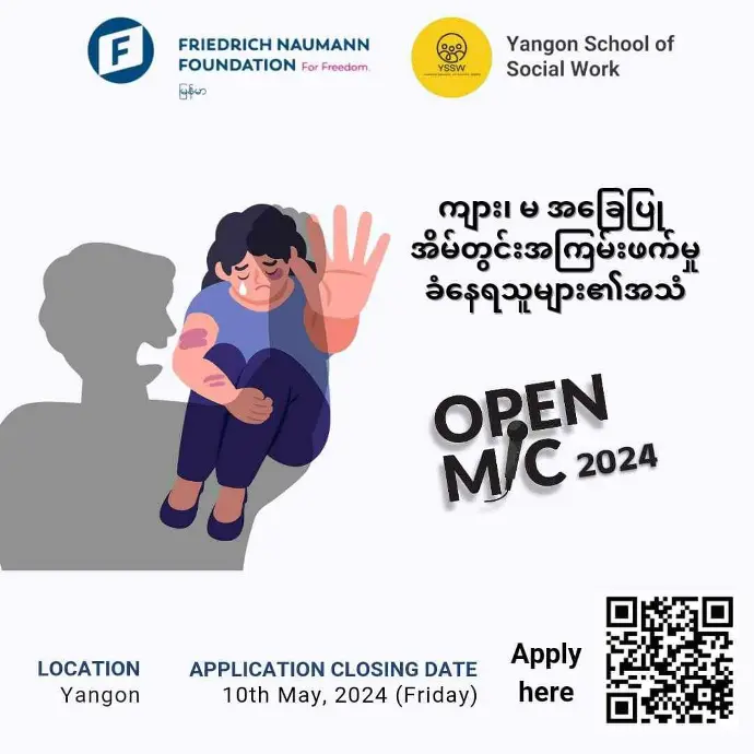 အကယ်လို့များ သင်ဟာလည်း ကျား၊ မ အခြေပြုအိမ်တွင်းအကြမ်းဖက်မှုကို လက်ရှိခံစားနေရတဲ့ ဒါမှမဟုတ် ခံစားခဲ့ရဖူးတဲ့ လူတစ်ယောက်ဖြစ်ပြီး ကိုယ့်ရဲ့ အတွေ့အကြုံကို တခြားသူတွေကို ဖွင့်ဟမျှဝေချင်တယ်ဆိုရင်တော့ OpenMic 2024 အစီအစဉ်လေးကို ပါဝင်ဖို့ဖိတ်ခေါ်ပါရစေနော်။