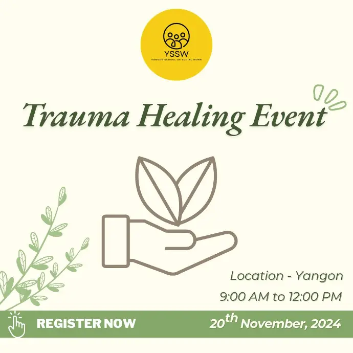 အထက်ဖော်ပြပါ လက္ခဏာတစ်ခုခု ခံစားဖူးတယ်ဆိုရင်တော့ ကျွန်တော်တို့ Yangon School of Social Work (YSSW) မှ ကျင်းပမည့် Trauma Healing Event မှာ ပါဝင်ဖို့ ဖိတ်ခေါ်ပါတယ်ခင်ဗျာ။