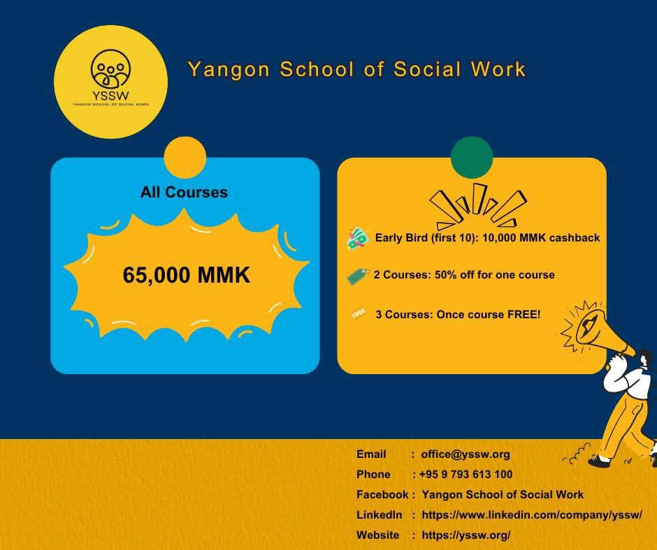 ဒါကြောင့်မိုလို Social Work အကြောင်းကိုစိတ်ဝင်စားပြီး သင်တန်းတက်ဖိုစဉ်းစားနေသူတွေအားလုံးပဲ YSSW ရဲ့ ကာလတို အတန်းလေးတွေတက်ပြီး Octoberလရဲ့ Golden Chance ကို သေချာအမိအရ ဖမ်းဆုပ်ဖိုအတွက် အခုပဲ အောက်ပါ Register Link မှာ စာရင်းသွင်းလိုက်ပါနော်။⬇️
